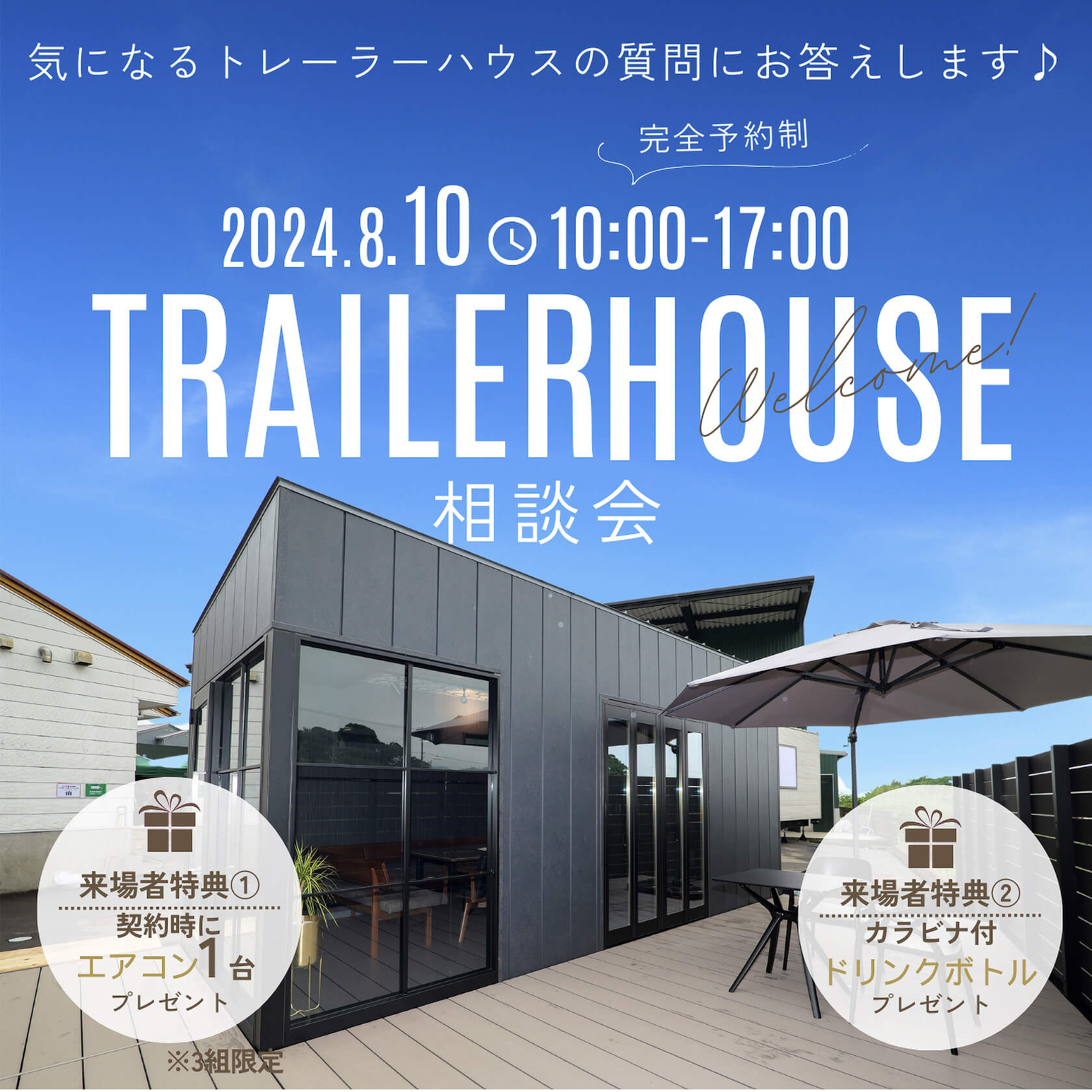 8/10(土)10:00~17:00で完全予約制のトレーラーハウス相談会を開催いたします!